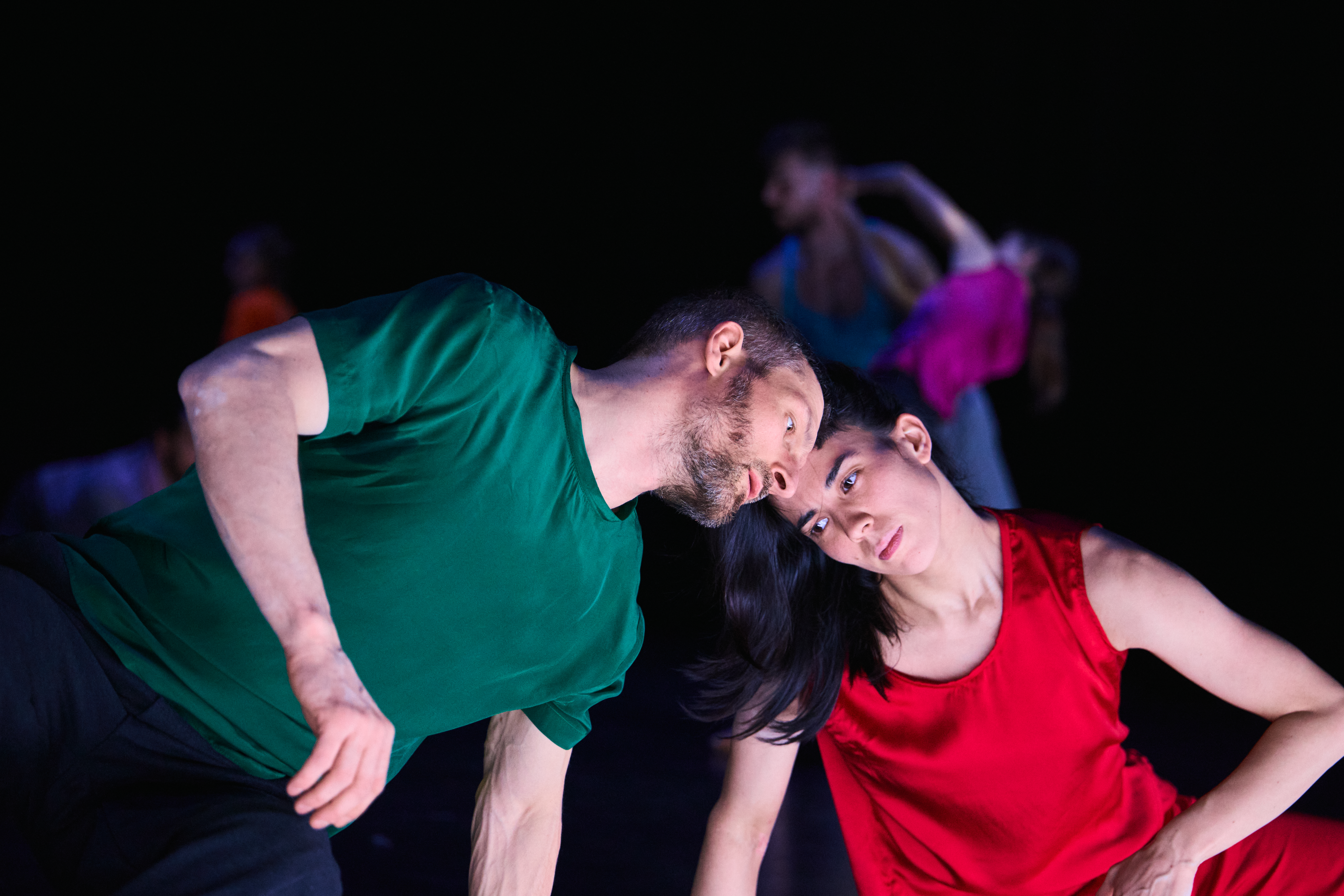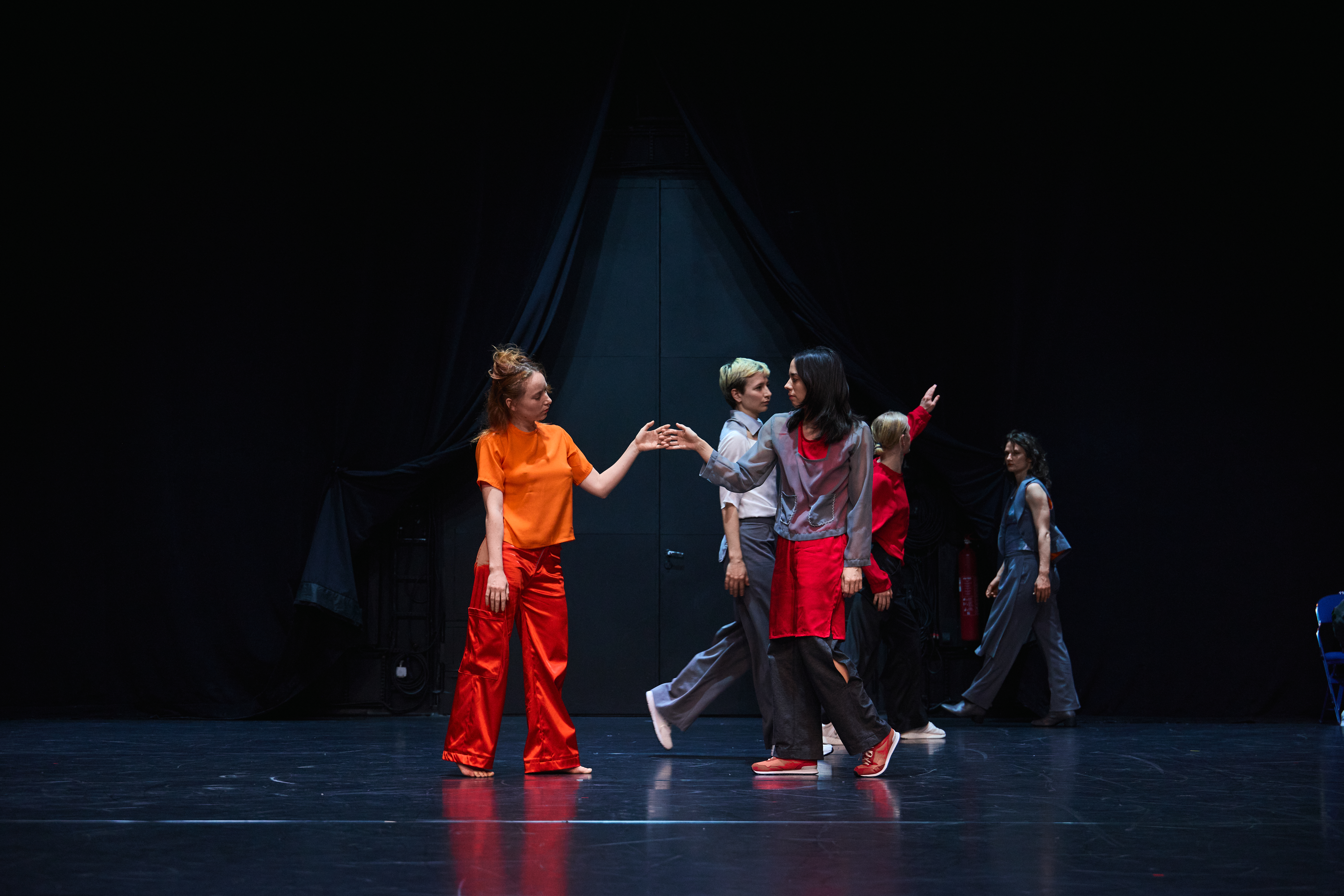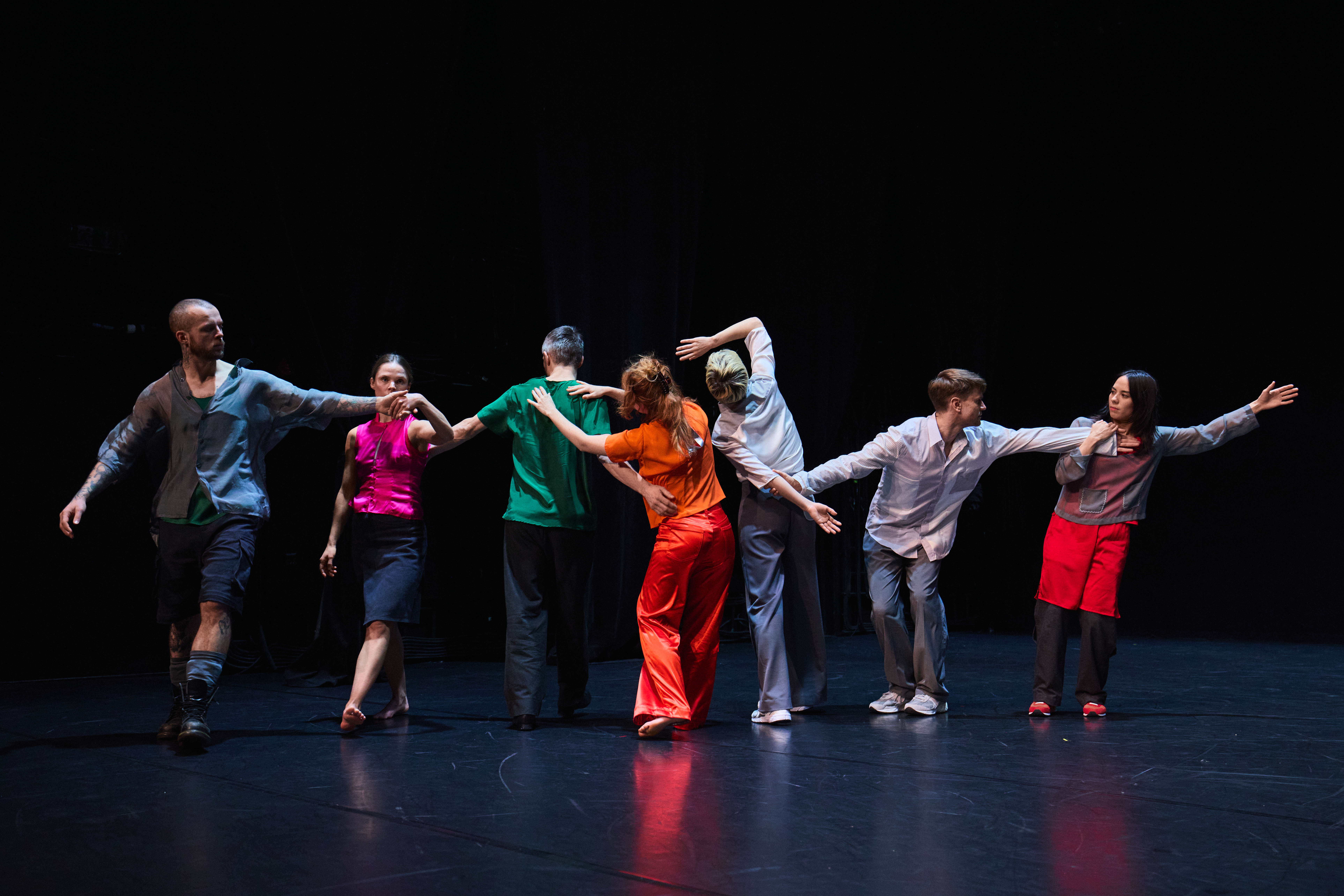 Fellesskapet i scenerommet er skjørt, fleksibelt og i stadig endring. Danserne beveger seg i et system som aldri står stille, der oppmerksomhet, rytme og relasjon må forhandles fra øyeblikk til øyeblikk.