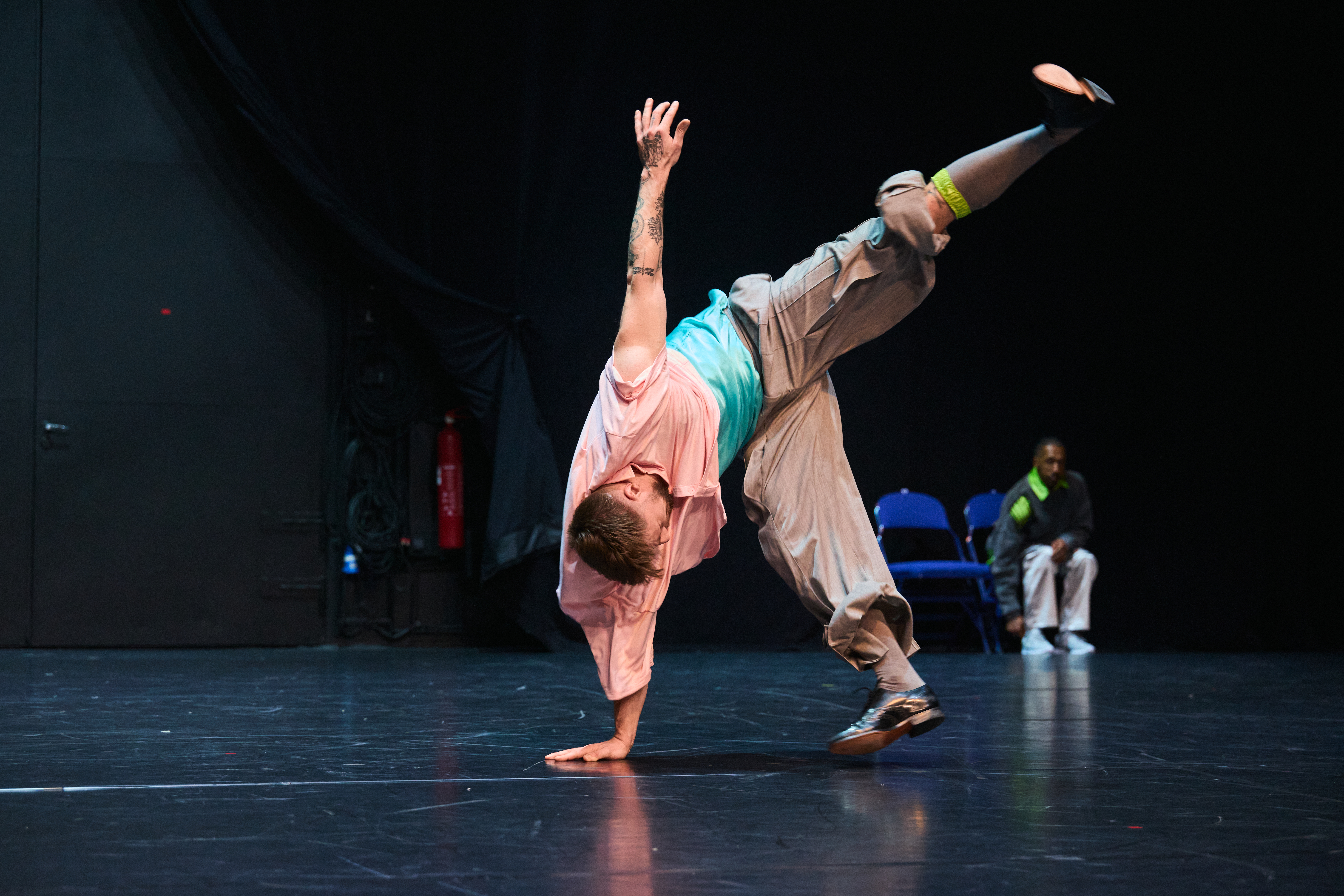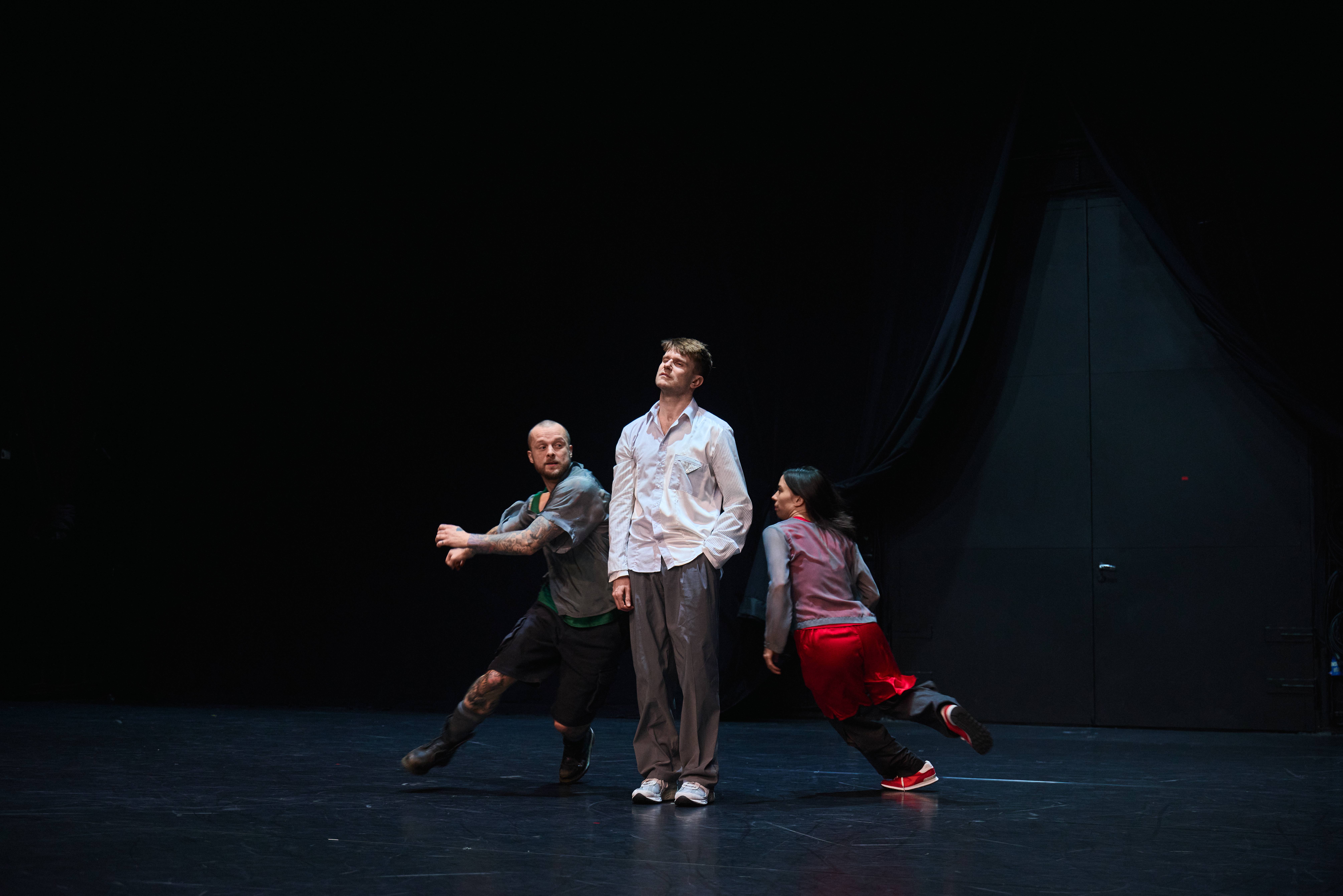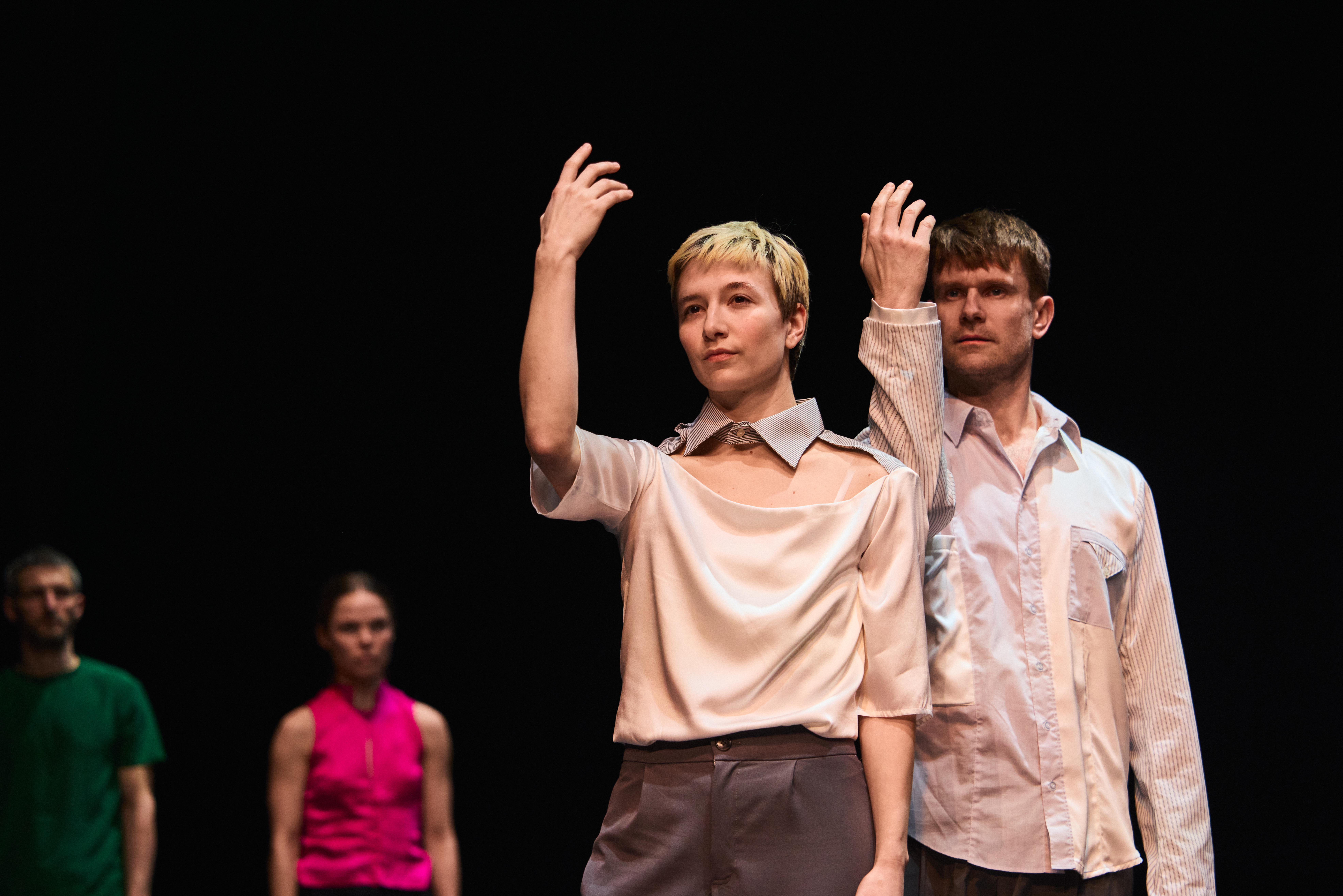 Fellesskapet i scenerommet er skjørt, fleksibelt og i stadig endring. Danserne beveger seg i et system som aldri står stille, der oppmerksomhet, rytme og relasjon må forhandles fra øyeblikk til øyeblikk.